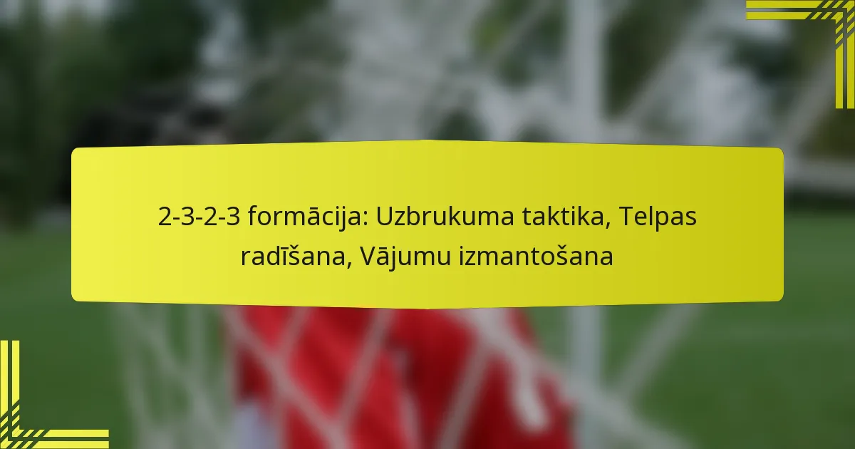 2-3-2-3 formācija ir stratēģiska izkārtojuma shēma futbolā, kas līdzsvaro aizsardzības stabilitāti ar uzbrukuma potenciālu, ietverot divus aizsargus, trīs pussargus, divus uzbrucējus un vārtsargu. Šī formācija ne tikai veicina dinamisku uzbrukuma spēli, bet arī rada specifiskas vājās vietas, ko var izmantot pretinieki. Efektīva izlūkošana un analīze komandām, kas izmanto šo formāciju, prasa labu izpratni par viņu taktiskajiem modeļiem un spēlētāju kustībām, ļaujot komandām sagatavoties un izmantot vājās vietas viņu stratēģijā.