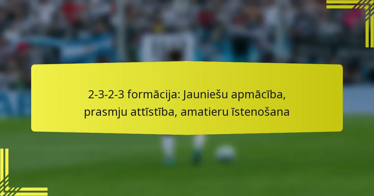 2-3-2-3 formācija ir efektīvs taktiskais izkārtojums jaunatnes futbolā, līdzsvarojot aizsardzības stabilitāti ar uzbrukuma iespējām. Veicinot individuālās un komandas prasmes, šī formācija mudina spēlētājus attīstīt daudzpusību un tehniskās spējas, vienlaikus veicinot komandas darbu un komunikāciju. Amatieru treneri var veiksmīgi ieviest šo formāciju, uzsverot skaidras lomas un pakāpeniski iepazīstinot spēlētājus ar taktiskajiem jēdzieniem.